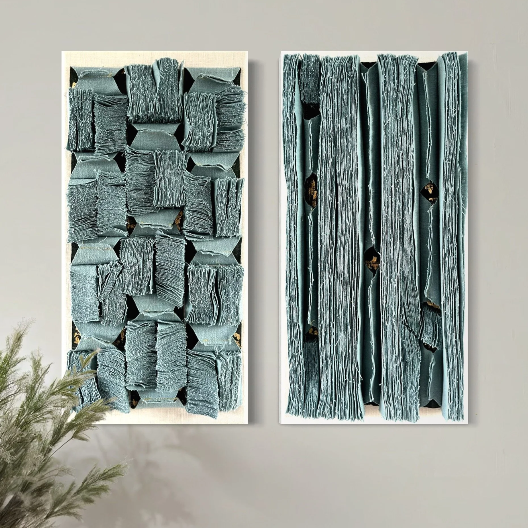 Geïnspireerd op handgemaakte keramiektegels, is dit wanddoek vervaardigd uit puur mintgroen linnen met accenten van bladgoud. De zachte structuur herinneren aan het ambacht en de kracht van imperfectie.